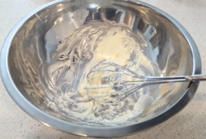 ▼1:無塩バター50gを、白っぽくなるまで泡立て機で混ぜる