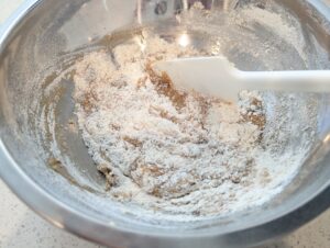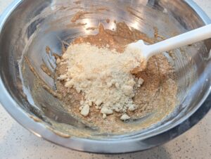▼7:アーモンドプードル60gを加えて、ゴムベラで生地を切るように混ぜます