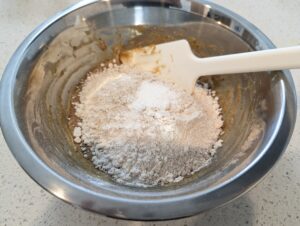 ▼4:全粒粉薄力粉100gとベーキングパウダー3gを加えてゴムベラで切るように混ぜる
